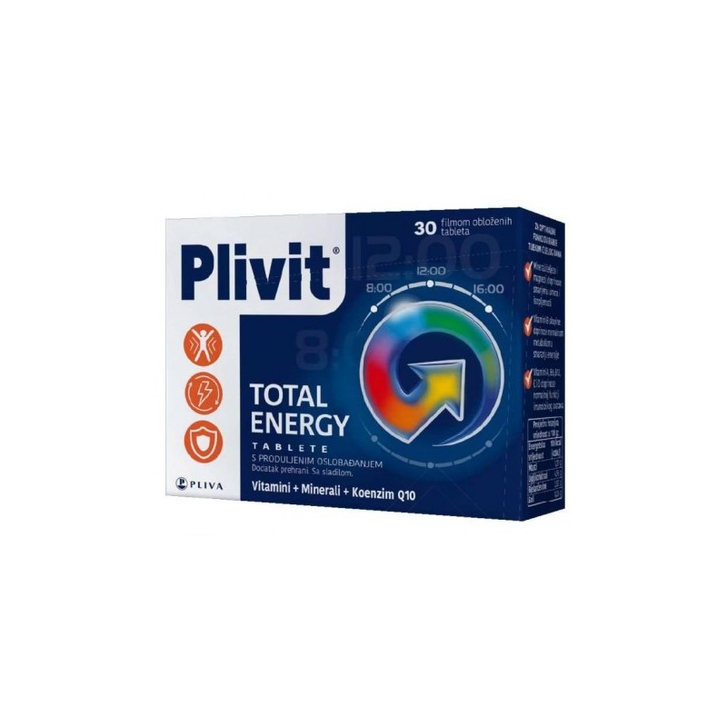Plivit Total Energy je vitaminsko-mineralni dodatak prehrani koji sadrži veliku dozu vitamina (1-4 puta preporučenog dnevnog unosa), minerale i koenzim Q10, te pomaže u smanjenju umora i stvaranju energije.